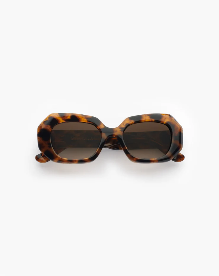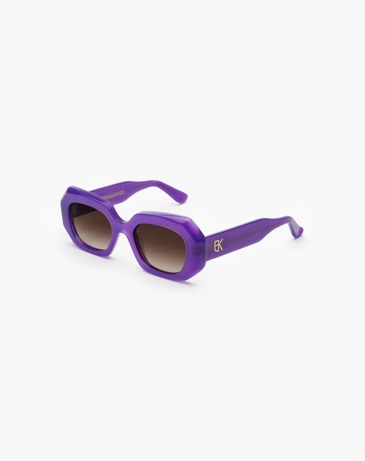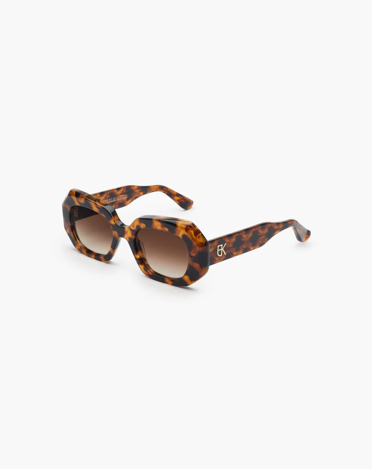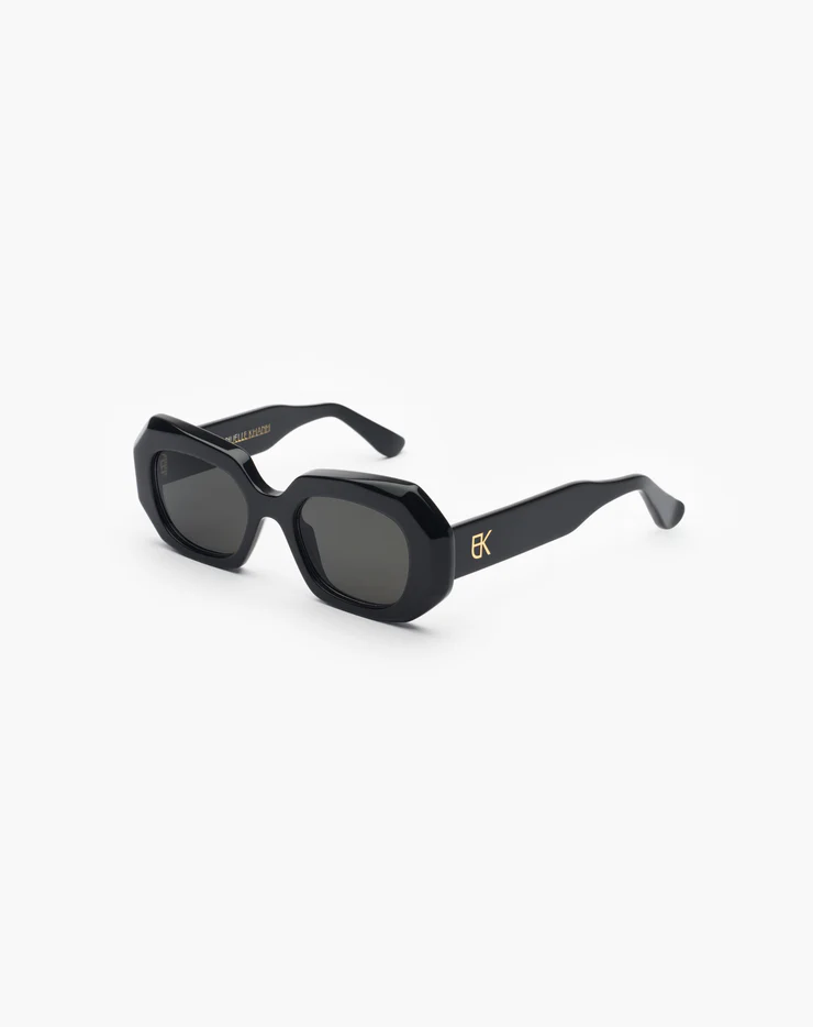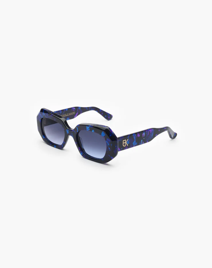 La solaire Dixie est une monture en acétate façonnée à la main en France. Son design affirmé se distingue par des biseaux prononcés, apportant du caractère à la silhouette. Les branches sont sublimées par un monogramme en métal doré, délicatement encapsulé sous résine, pour une signature élégante et emblématique.